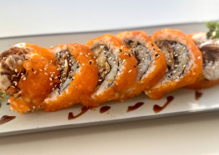Spicy tuna,cucumber inside. crunchy flake on the outside topped with masago and sweet and spicy sauce.